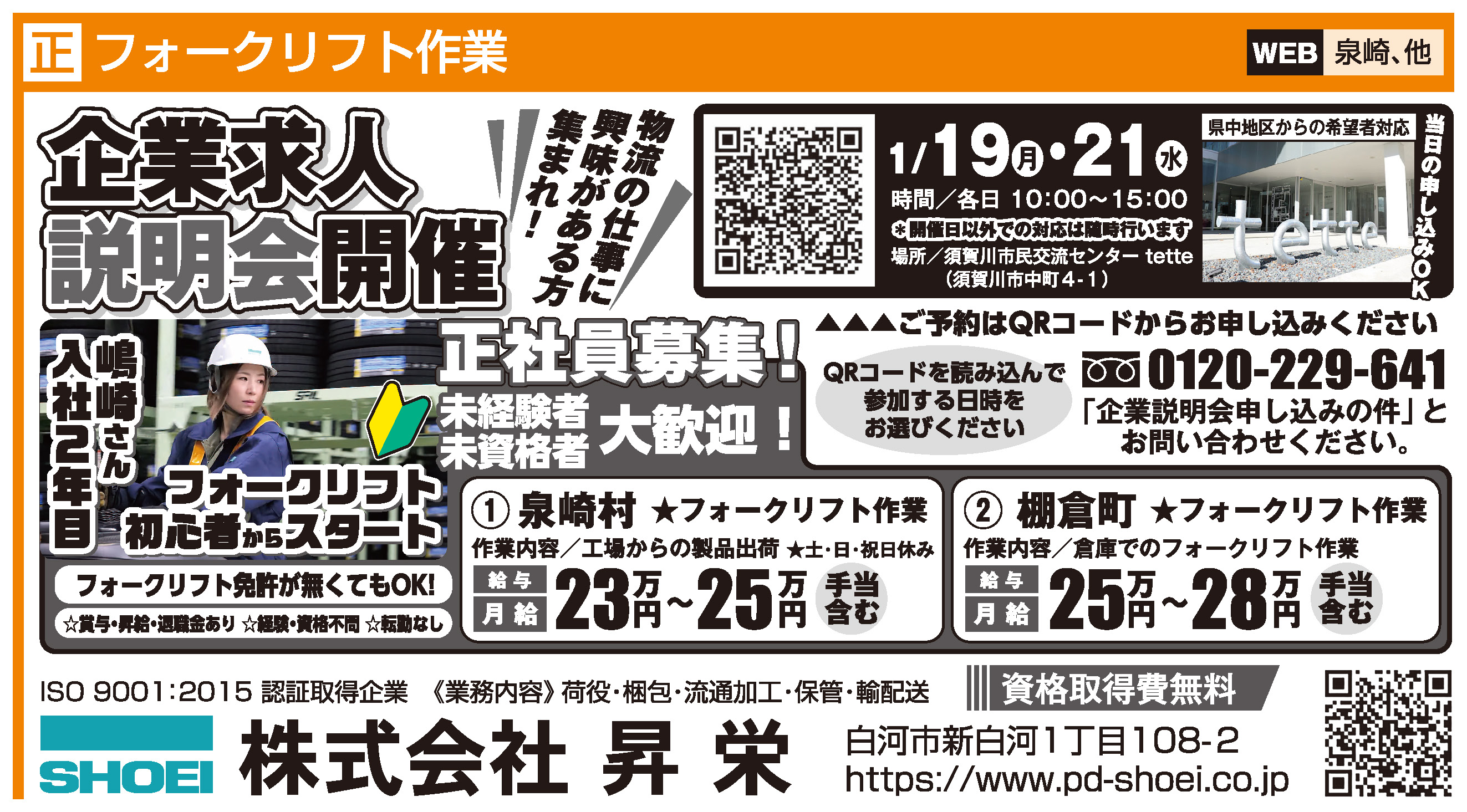 | 備考 | 【求人説明会のご案内】 場所:須賀川市民交流センター tette 日付:1月19日(月)・21日(水) 時間:10:00~15:00(1時間単位での個人相談会) 予約方法:下記のリンクより日時のご指定をお願いいたします。 当日受付OK! お問い合わせ先:フリーダイヤル0120-229-641「説明会参加」の件とお伝えください。 《JOBまざーる紙面広告》 ![]() |
