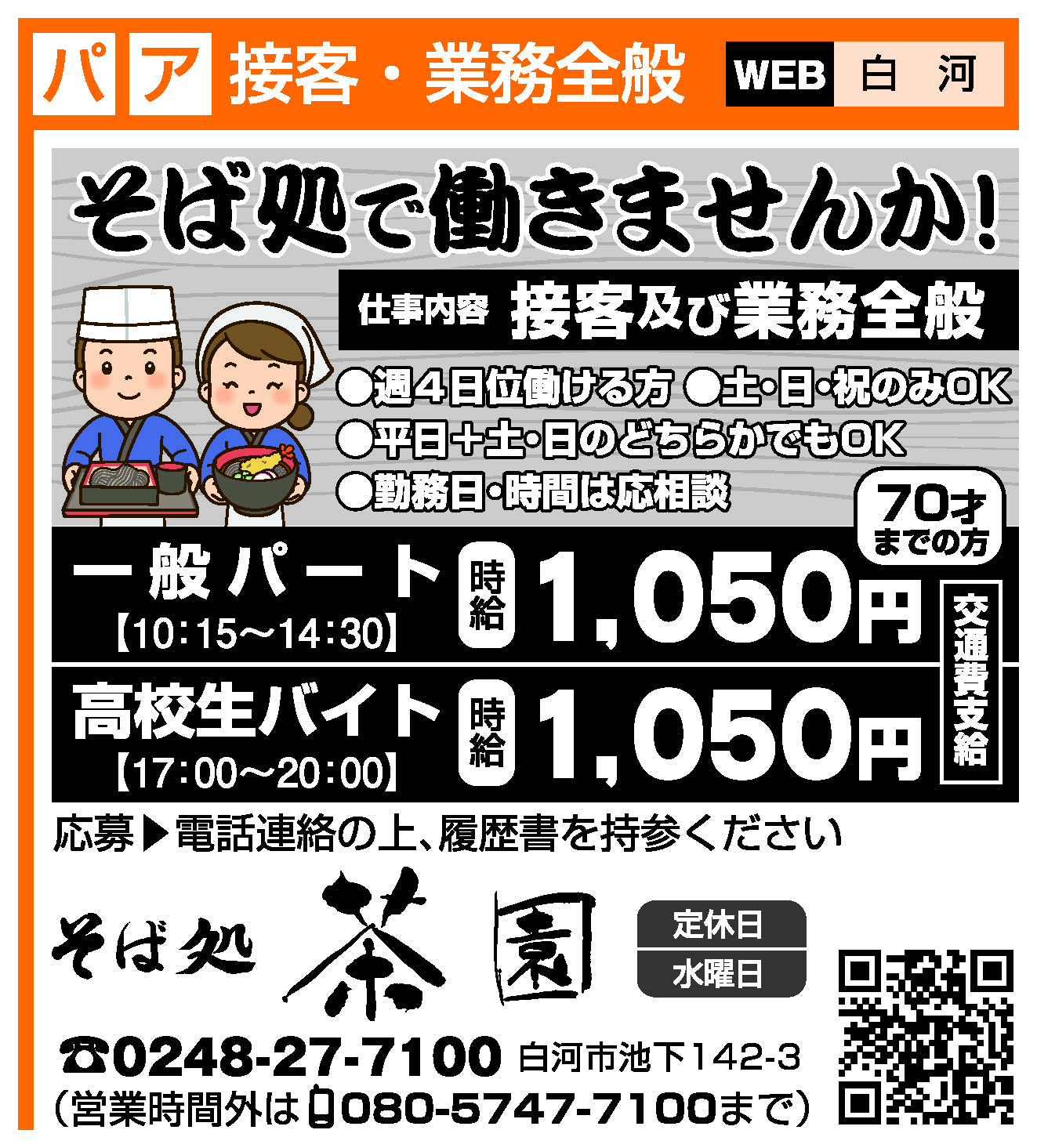 | 仕事内容 | そば処茶園での接客のほか、業務全般のお仕事です。 ☆週4日位働ける方 ☆土・日・祝のみOK ☆平日+土・日のどちらかでもOK ☆勤務日・時間は応相談 |