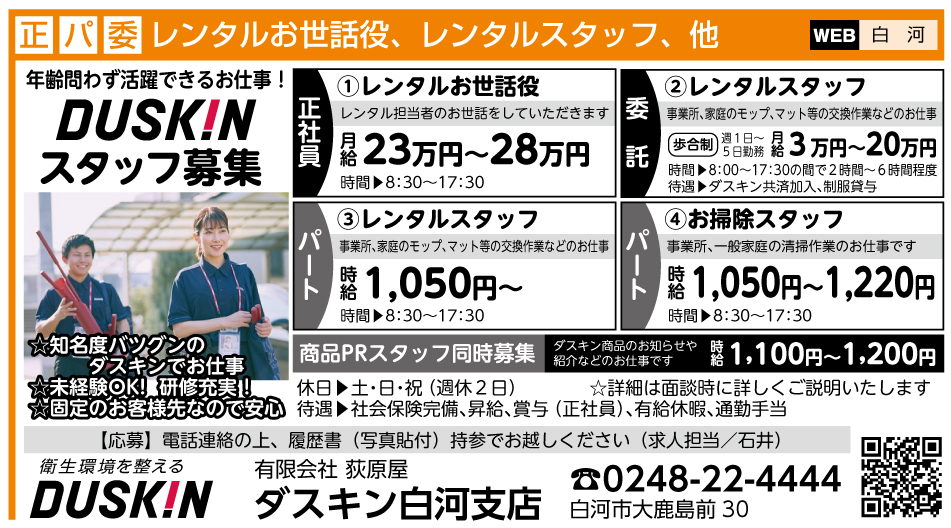 | 応募方法 | 「JOBまざーるWEB」の応募フォームよりご応募または☎0248-22-4444までお気軽にご連絡ください。 |
