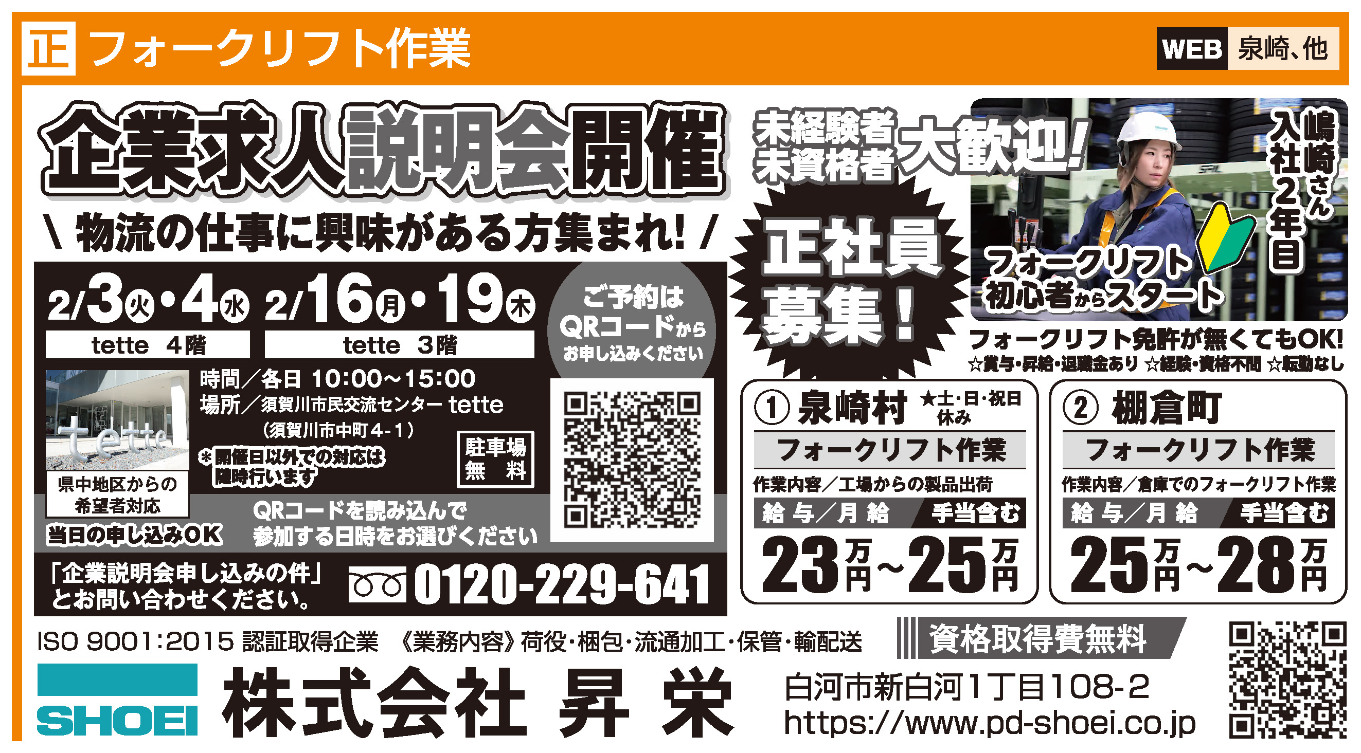 | 備考 | 【求人説明会のご案内】 場所:須賀川市民交流センター tette 日付:2月3日(火)・4日(水) 会場/tette4階 2月16日(月)・19日(木) 会場/tette3階 時間:10:00~15:00(1時間単位での個人相談会)予約方法:下記のリンクより日時のご指定をお願いいたします。 当日受付OK! お問い合わせ先:フリーダイヤル0120-229-641「説明会参加」の件とお伝えください。 《JOBまざーる紙面広告》 ![]() |
