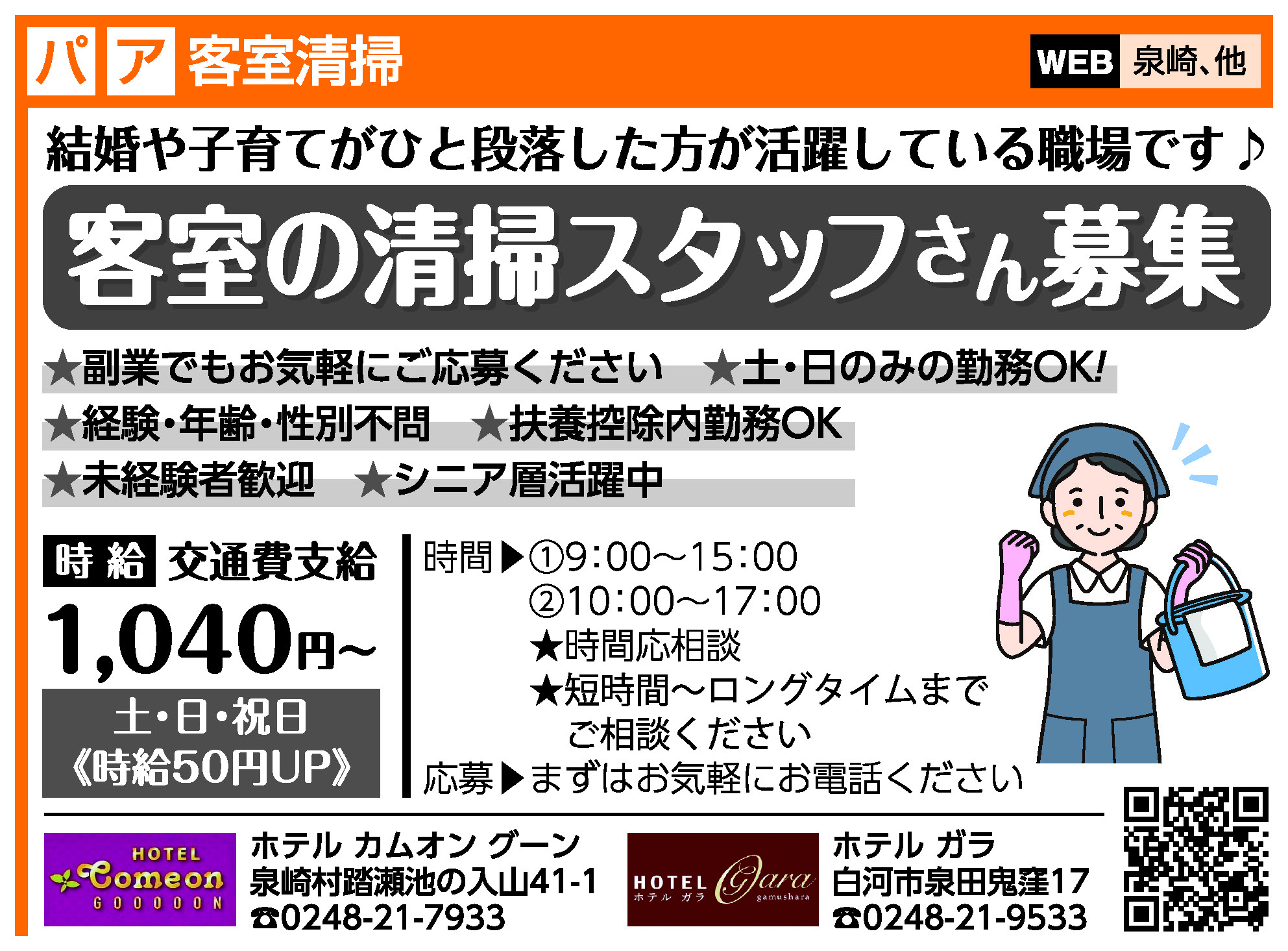 | 応募方法 | 「JOBまざーるWEB」の応募フォームよりご応募または☎0248-21-7933(泉崎)・☎0248-21-9533(白河)までお気軽にご連絡ください。 |
