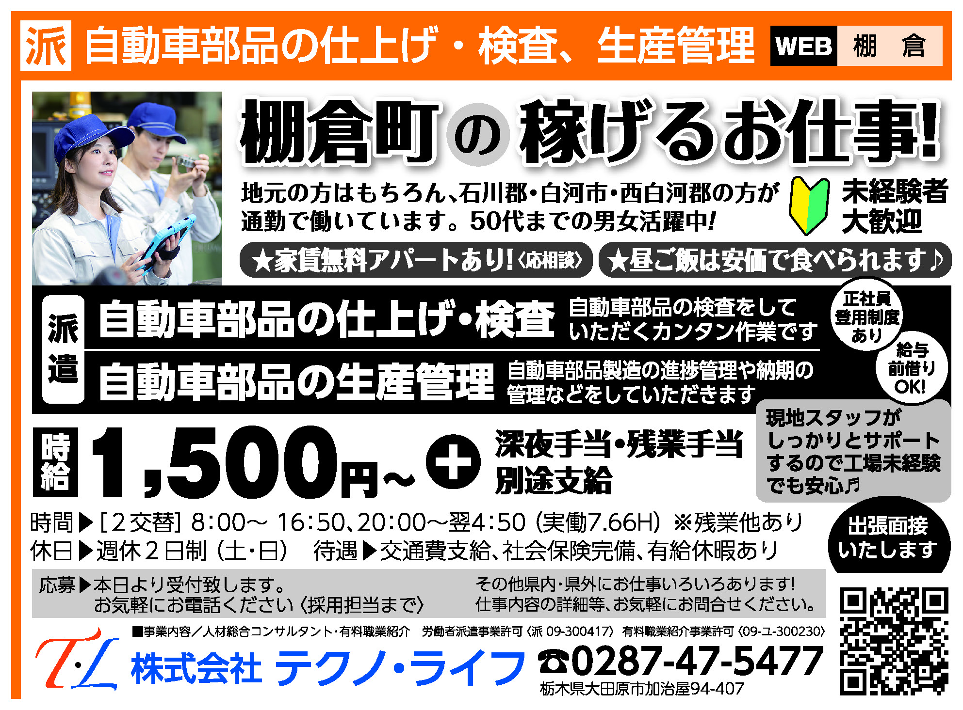 | 仕事内容 | 自動車部品製造工場において部品の仕上げや検査をしていただくカンタン作業です。 現地スタッフがしっかりとサポートするので、工場未経験でも安心♬ ◎地元の方はもちろん、石川郡・白河市・西白河郡の方が通勤で働いています ◆稼げるお仕事!! ◆未経験者でもOK! ◆50代までの男女活躍中! ◆給与前借りOK! *家賃無料アパートあり〈応相談〉 *昼ご飯は安価で食べられます♪ |
