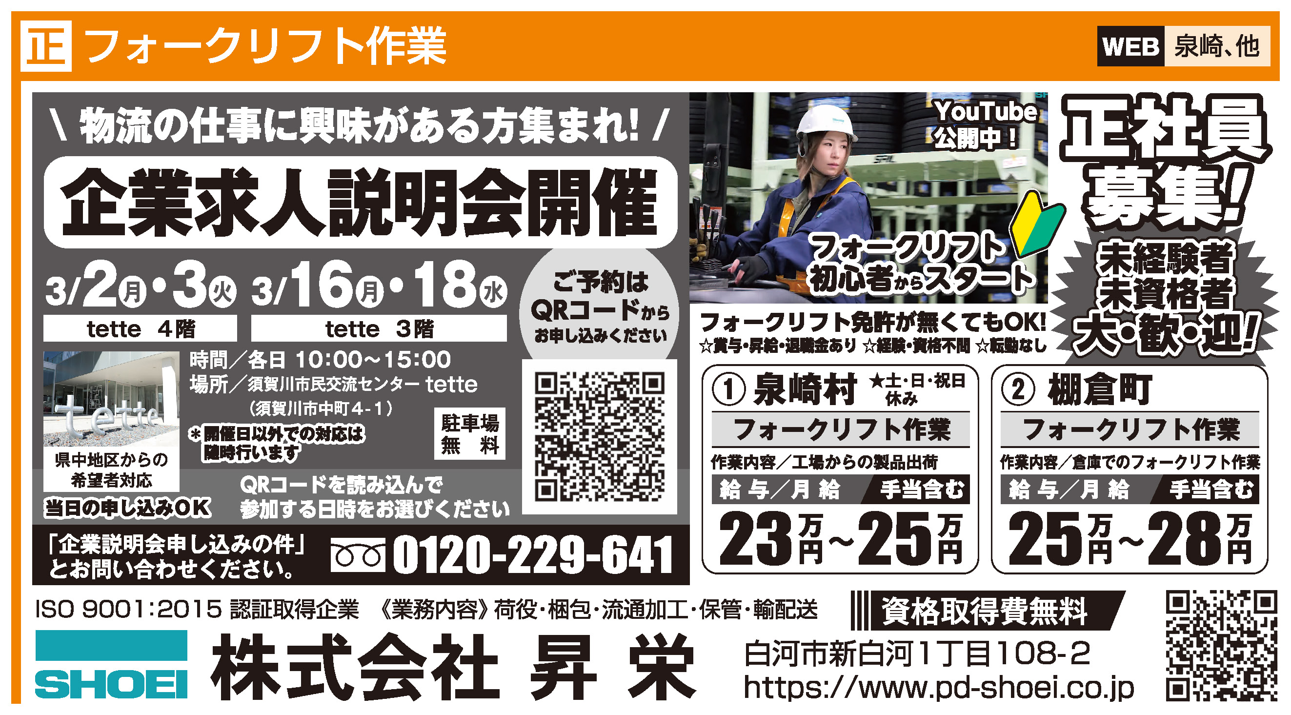 | 備考 | 【求人説明会のご案内】 場所:須賀川市民交流センター tette 日付:3月2日(月)・3日(火)会場/tette4階 3月16日(月)・18日(水)会場/tette3階 時間:10:00~15:00(1時間単位での個人相談会)予約方法:下記のリンクより日時のご指定をお願いいたします。 当日受付OK! お問い合わせ先:フリーダイヤル0120-229-641「説明会参加」の件とお伝えください。 《JOBまざーる紙面広告》 ![]() |