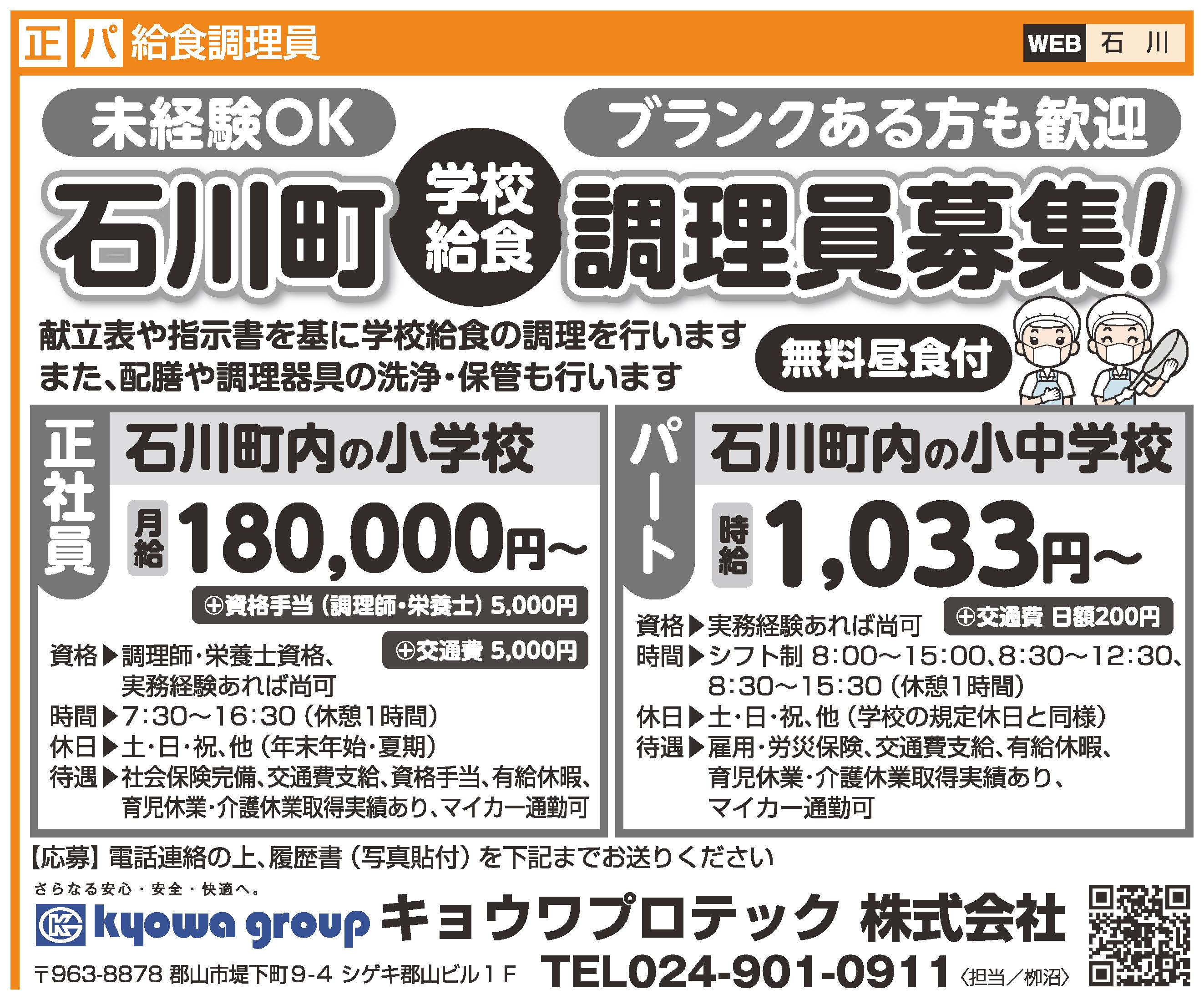 | 仕事内容 | 石川町内の小学校で、決められた献立を基に給食調理を行っていただきます。 調理器具の洗浄や調理室等の清掃も行います |
