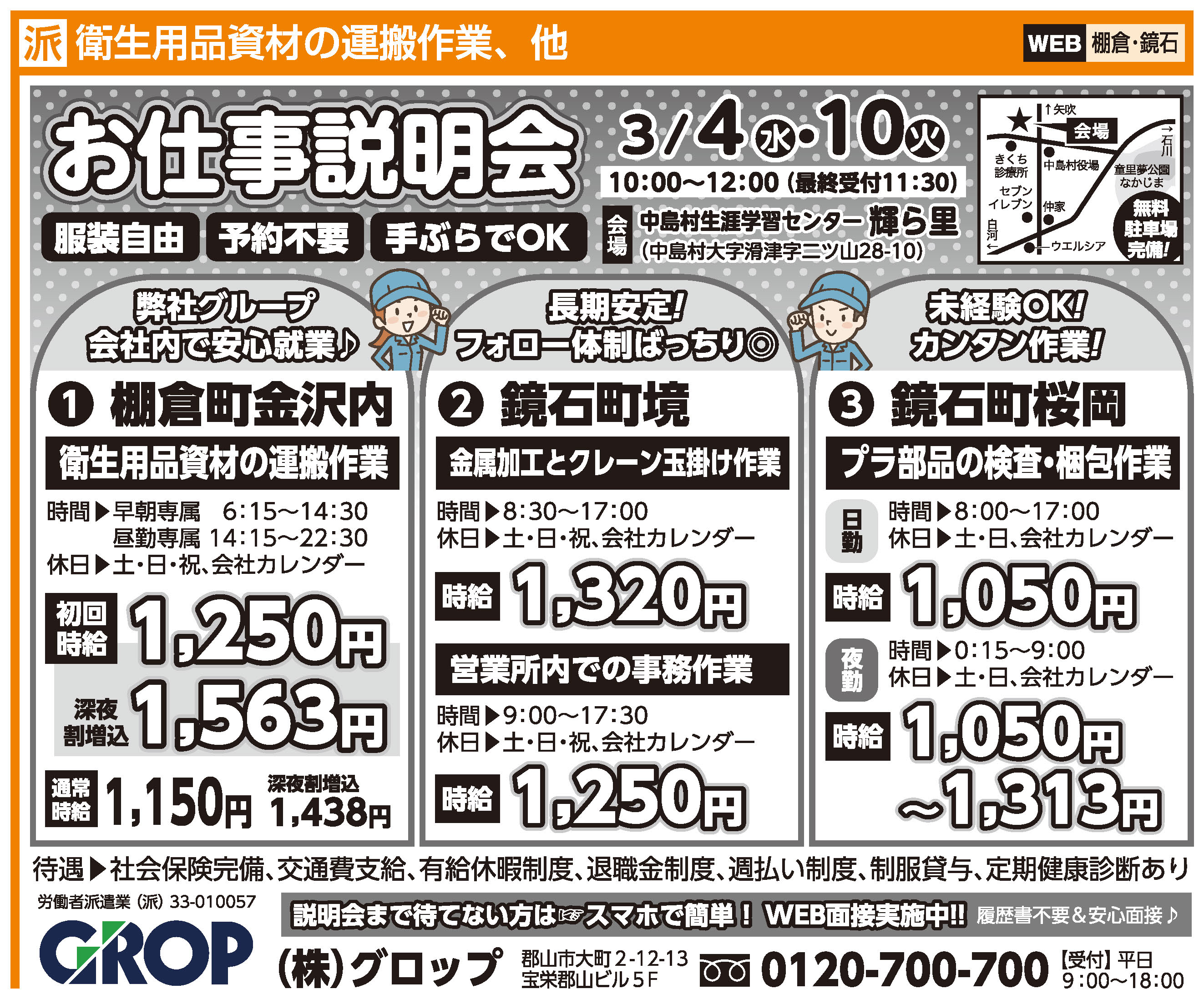 | 待遇 | 〇希望日払い制度 〇各種社会保険完備 (雇用保険・健康保険・厚生年金・介護保険・労災保険) 〇有給休暇制度(入社後6ヶ月経過後) 〇定期健康診断 〇無期雇用制度&キャリアアップ制度 〇退職金制度(規定有) 〇交通費支給(規定内支給) 〇車通勤可 〇制服貸与 〇食堂、休憩室、更衣室、ロッカーあり |