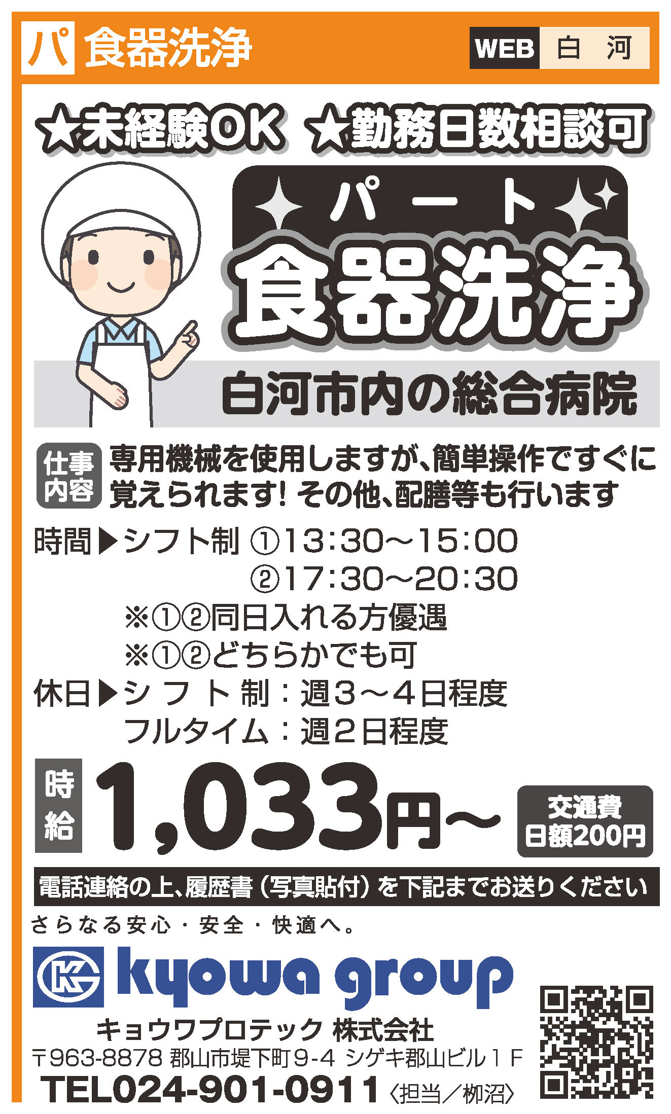 | 仕事内容 | 白河市内の病院で、食器の洗浄を行っていただきます。 専用機械を使用しますが、簡単操作ですぐ覚えられます! その他、配膳等も行います |