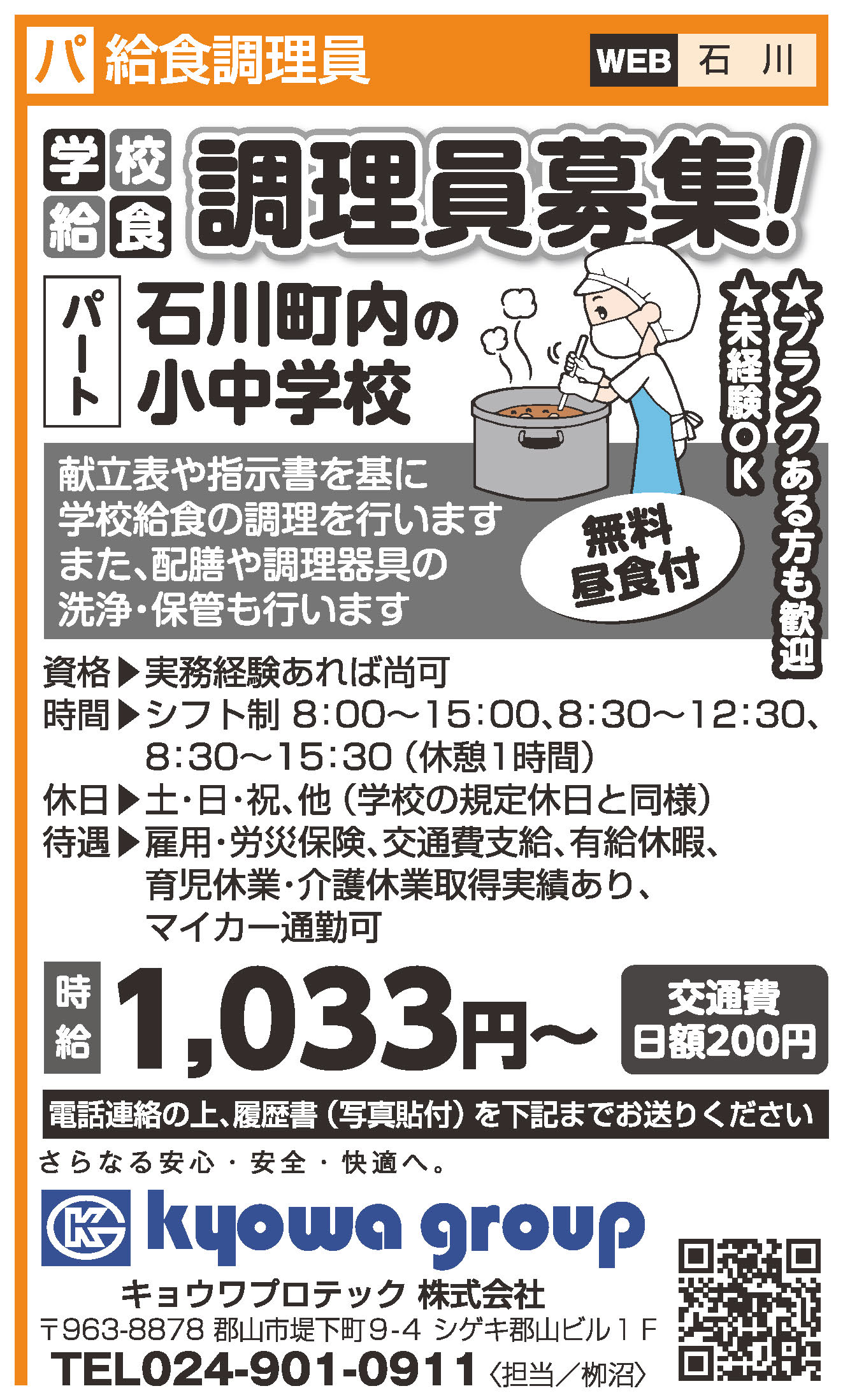 | 仕事内容 | 石川町内の小中学校で、決められた献立を基に給食調理を行っていただきます。 調理器具の洗浄や調理室等の清掃も行います |