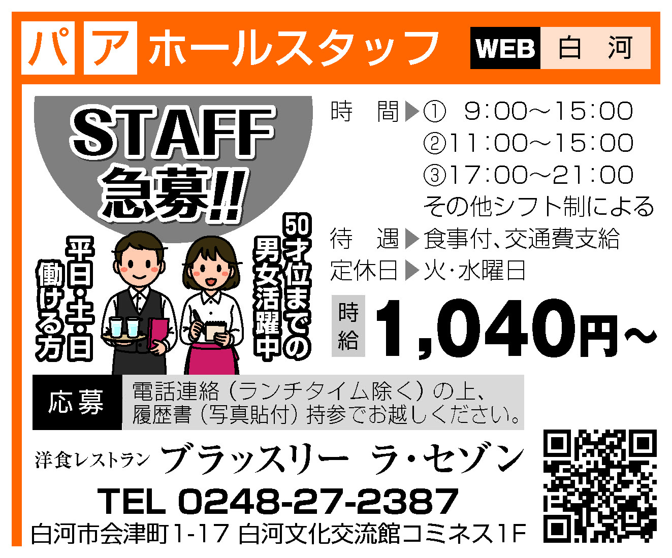| 応募資格 | ★50才位まで ★平日、土・日働ける方 |