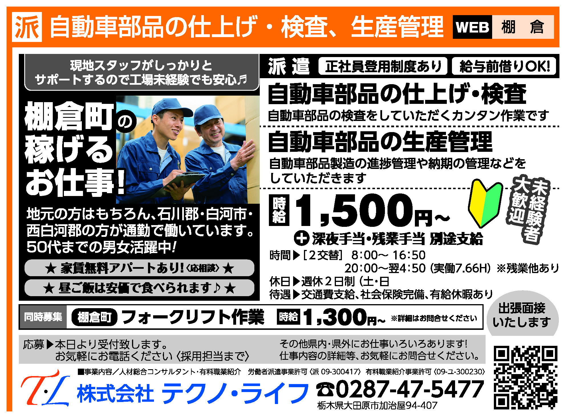 | 仕事内容 | 自動車部品製造工場において部品の仕上げや検査をしていただくカンタン作業です。 現地スタッフがしっかりとサポートするので、工場未経験でも安心♬ ◎地元の方はもちろん、石川郡・白河市・西白河郡の方が通勤で働いています ◆稼げるお仕事!! ◆未経験者でもOK! ◆50代までの男女活躍中! ◆給与前借りOK! *家賃無料アパートあり〈応相談〉 *昼ご飯は安価で食べられます♪ |