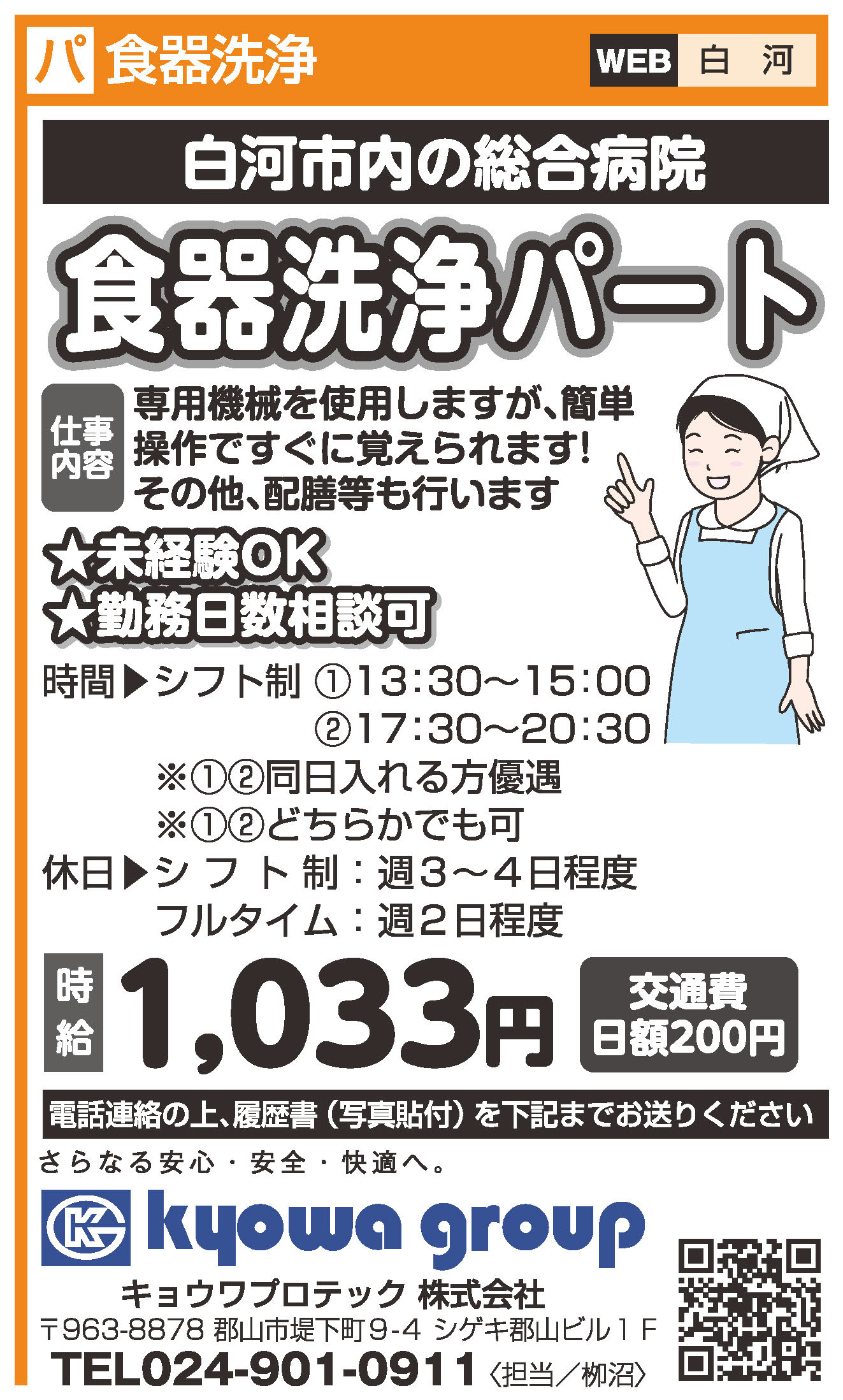 | 仕事内容 | 白河市内の病院で、食器の洗浄を行っていただきます。 専用機械を使用しますが、簡単操作ですぐ覚えられます! その他、配膳等も行います |