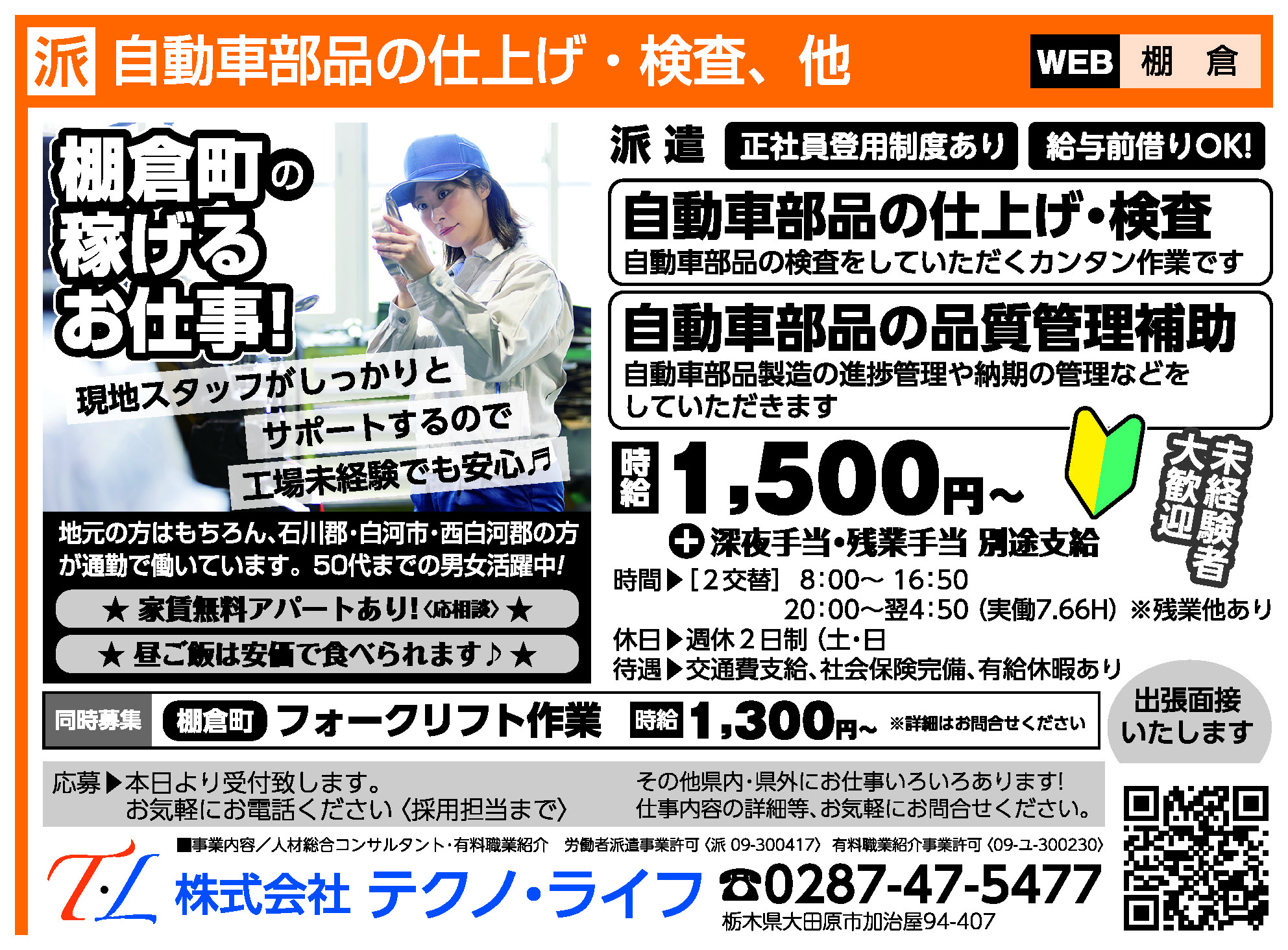 | 仕事内容 | 自動車部品製造工場において部品の仕上げや検査をしていただくカンタン作業です。 現地スタッフがしっかりとサポートするので、工場未経験でも安心♬ ◎地元の方はもちろん、石川郡・白河市・西白河郡の方が通勤で働いています ◆稼げるお仕事!! ◆未経験者でもOK! ◆50代までの男女活躍中! ◆給与前借りOK! *家賃無料アパートあり〈応相談〉 *昼ご飯は安価で食べられます♪ |